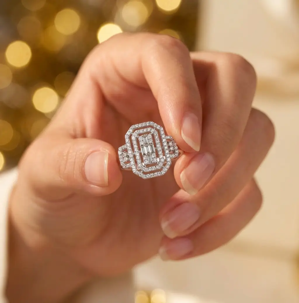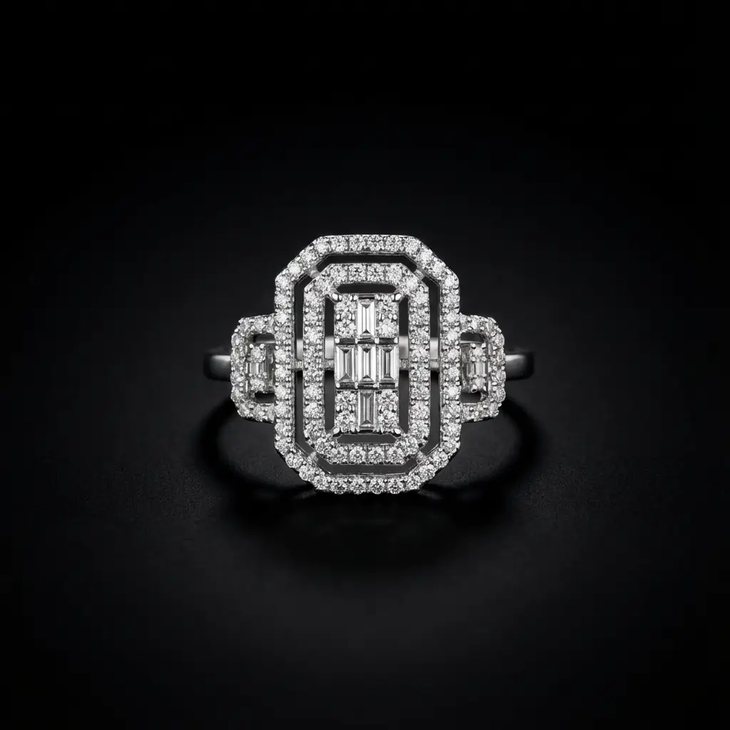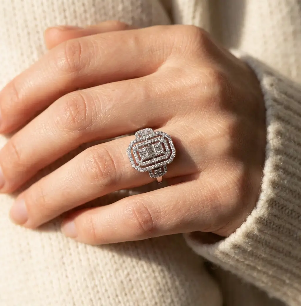 Inspirée des bijoux glamour des années 1920, cette bague art déco en argent 925 est conçue pour capturer chaque rayon de lumière. Son plateau rectangulaire à angles adoucis est structuré par des lignes de zircons taille baguette au centre, signature du style art déco. Autour, un double halo de micro-oxydes de zirconium ronds crée un effet pavé luxueux qui rappelle les bagues de cocktail de haute joaillerie.