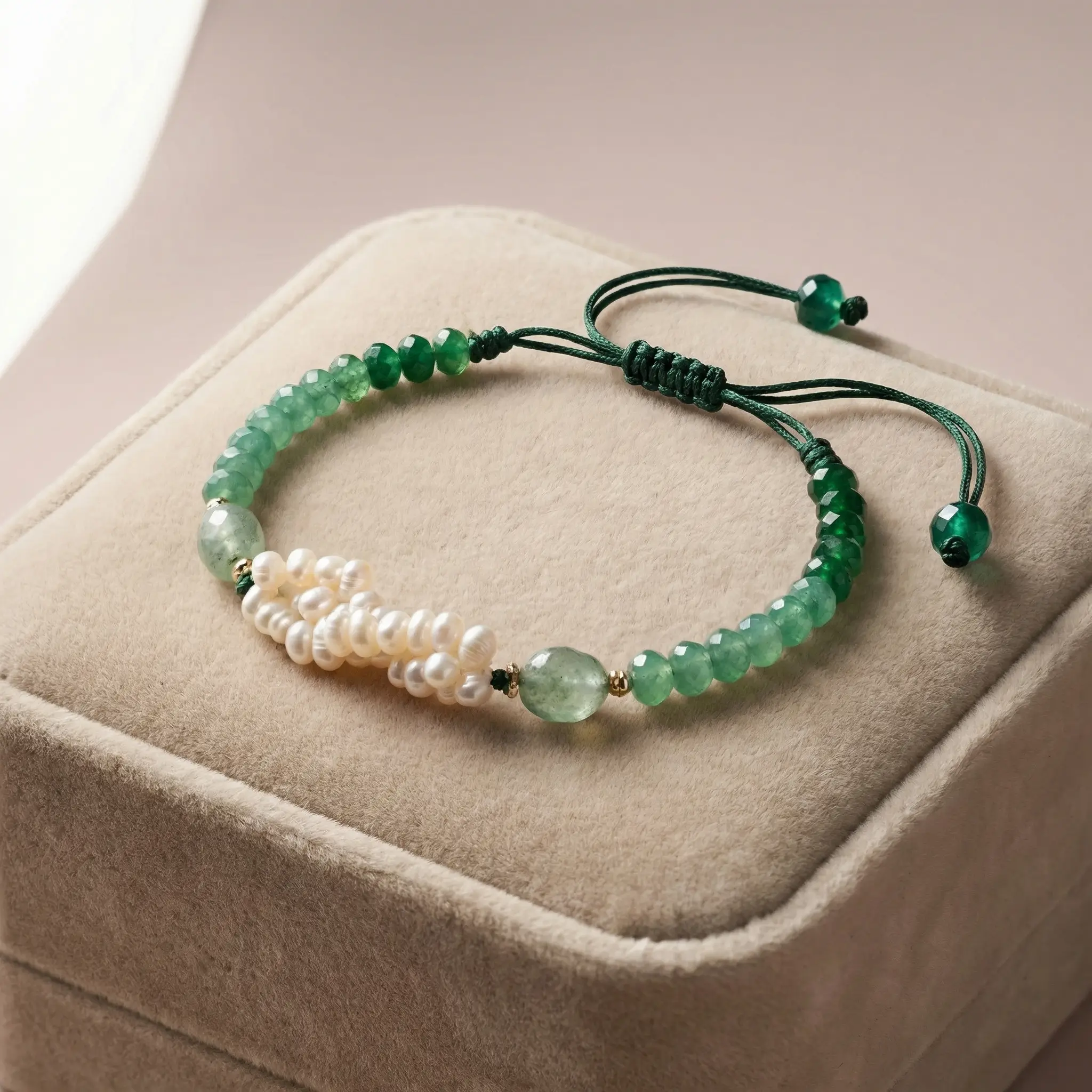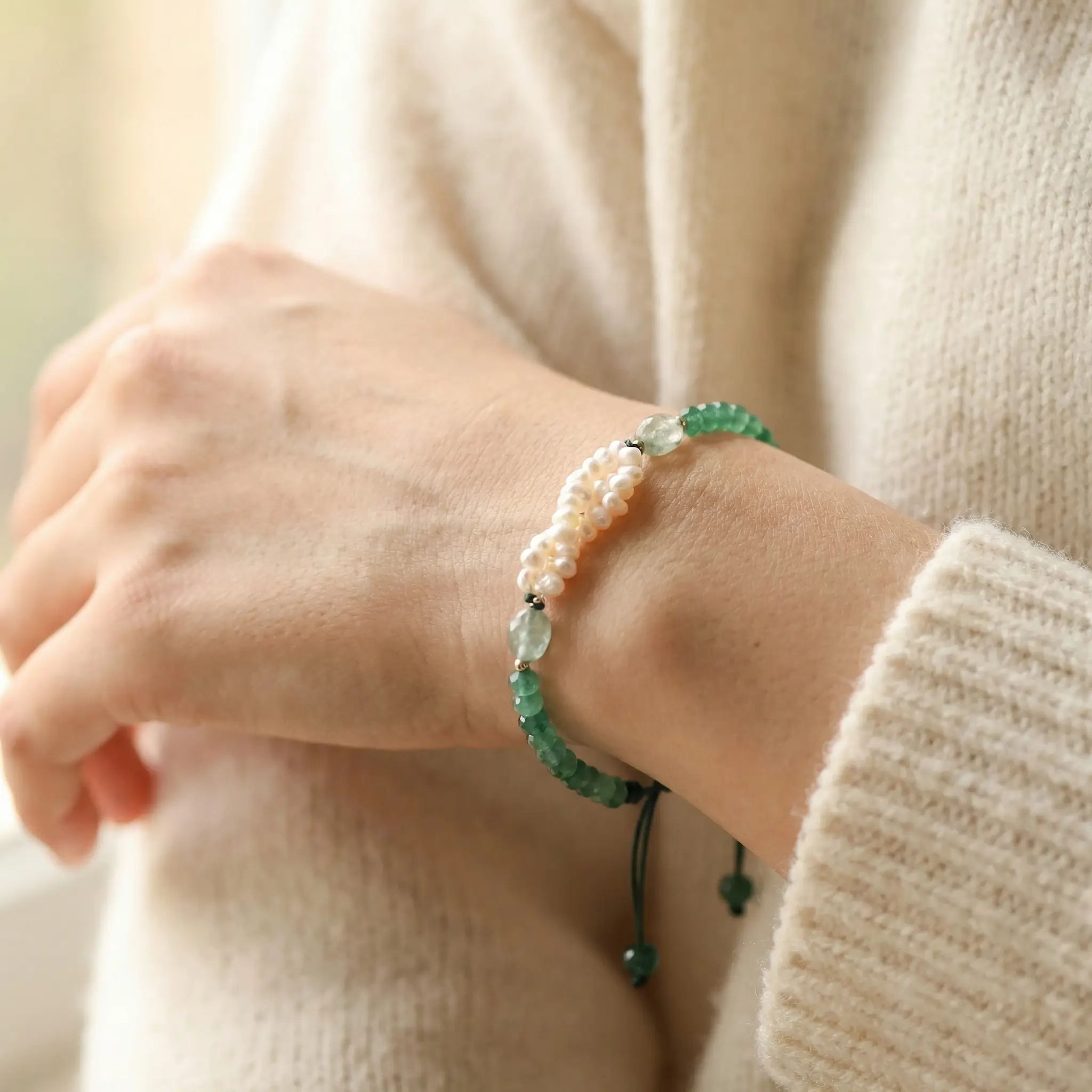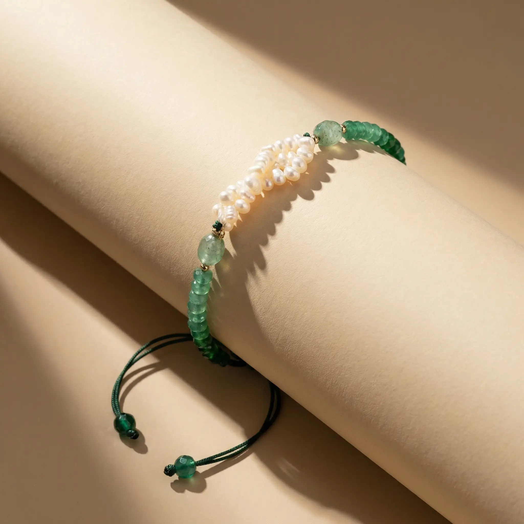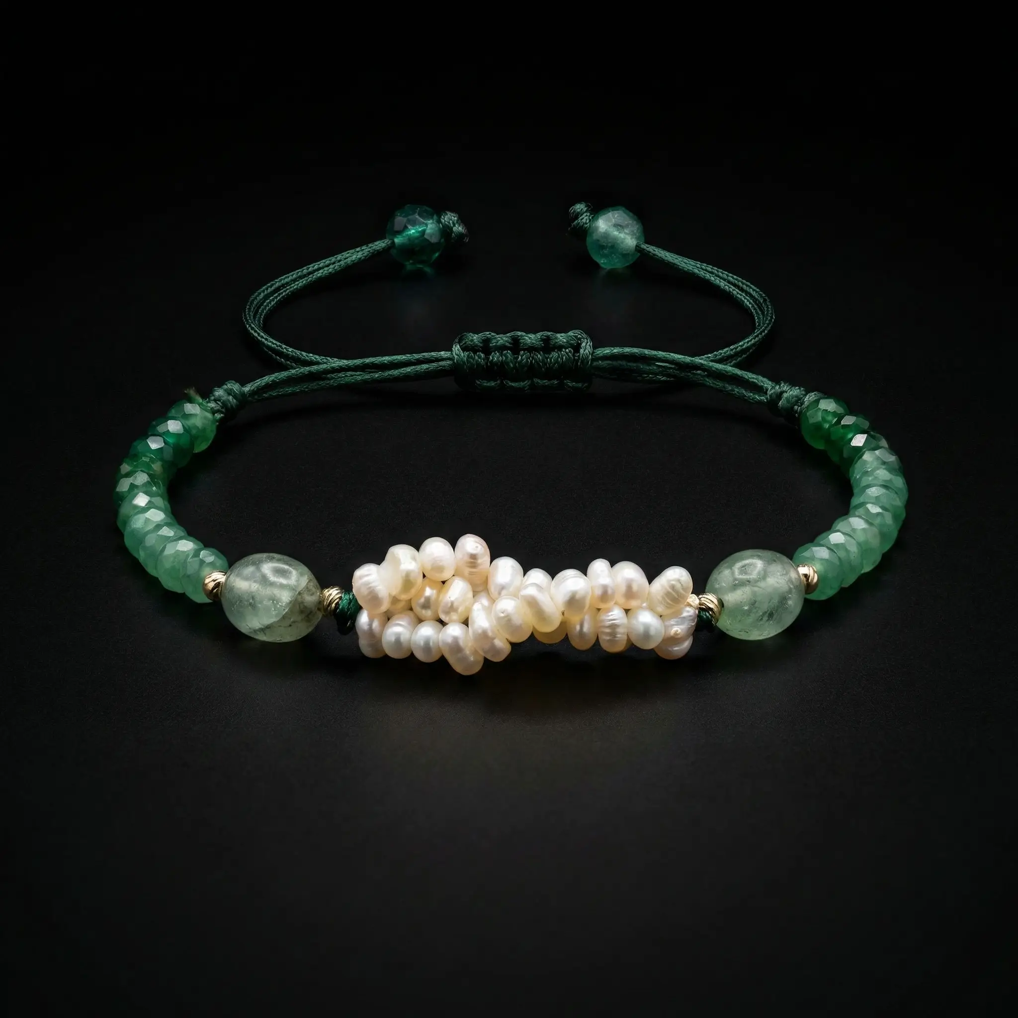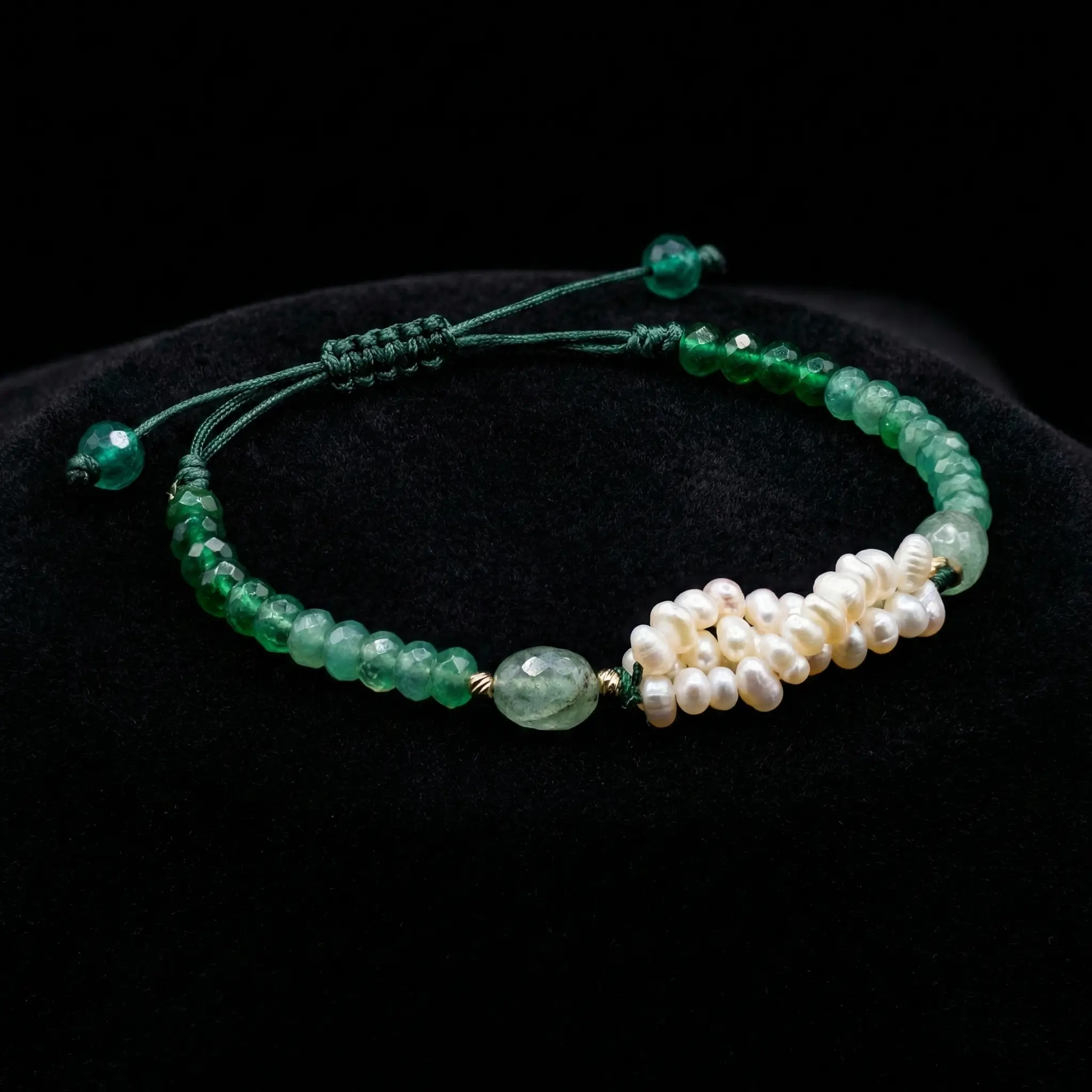 Un bracelet ajustable au charme irrésistible, combinant la vivacité de pierres vertes facettées, la douceur des véritables perles d’eau douce, et de délicates finitions en or 18 carats. Le bijou casual-chic par excellence.