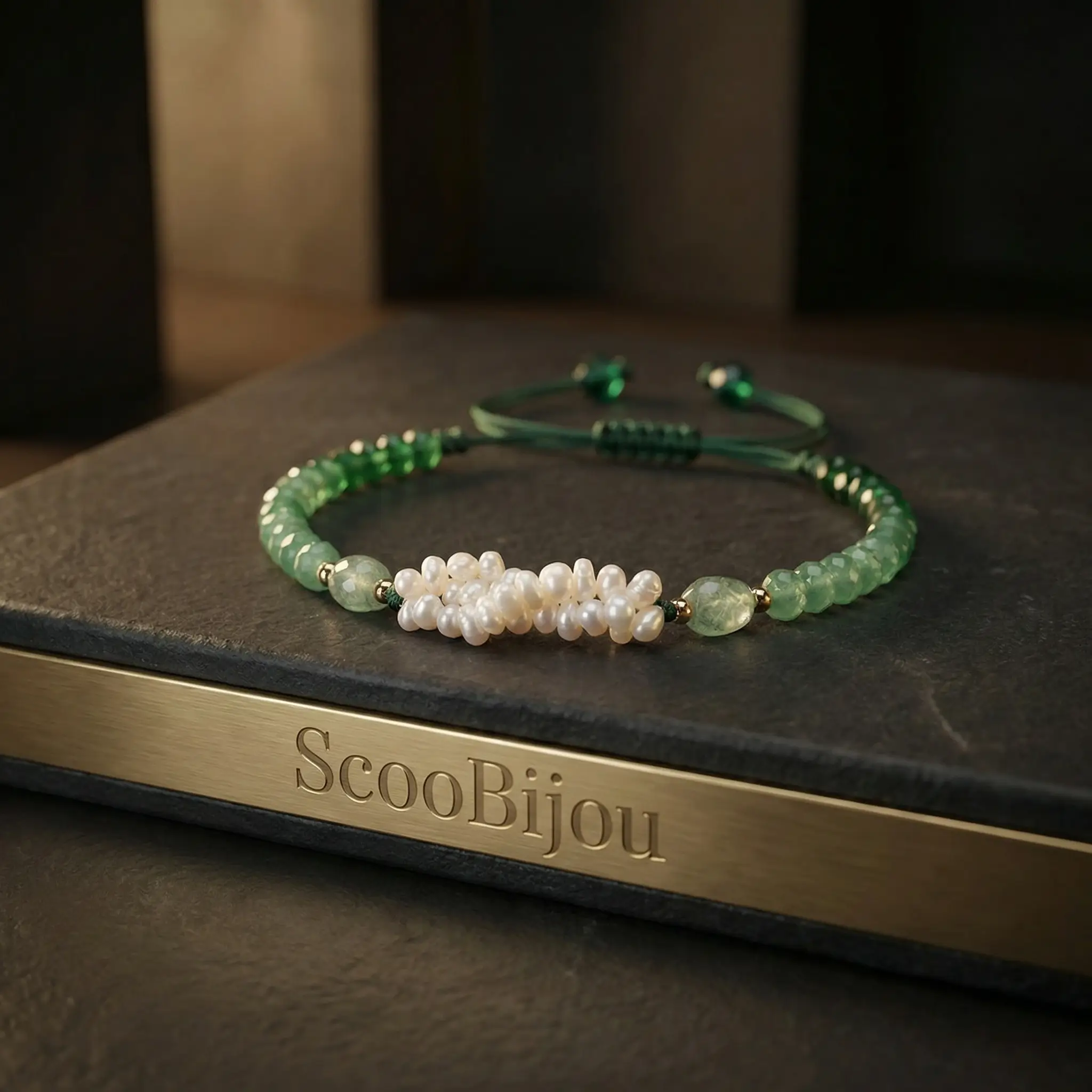 Ajoutez une touche de fraîcheur et de raffinement à votre quotidien avec le Bracelet Ajustable Oasis de ScooBijou. Conçu pour les femmes qui recherchent une élégance décontractée sans faire de compromis sur la qualité, ce bijou artisanal est une véritable merveille. Il arbore une harmonie parfaite entre des pierres vertes facettées captant magnifiquement la lumière, un cœur central composé de véritables perles d’eau douce (« Jouher »), et de fines intercalaires en or massif 18 carats. Son cordon tressé façon macramé, en plus d’offrir une grande résistance, permet un ajustement parfait à tous les poignets. Idéal à porter seul pour une touche discrète ou en accumulation avec votre montre préférée, c’est le cadeau parfait pour célébrer une amitié ou se faire plaisir.