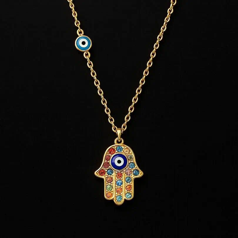 Ce collier en acier inoxydable de qualité supérieure est orné de zircons étincelants et d’un pendentif Khmissa, symbole de protection et de chance. La chaîne est réglable pour un ajustement parfait.