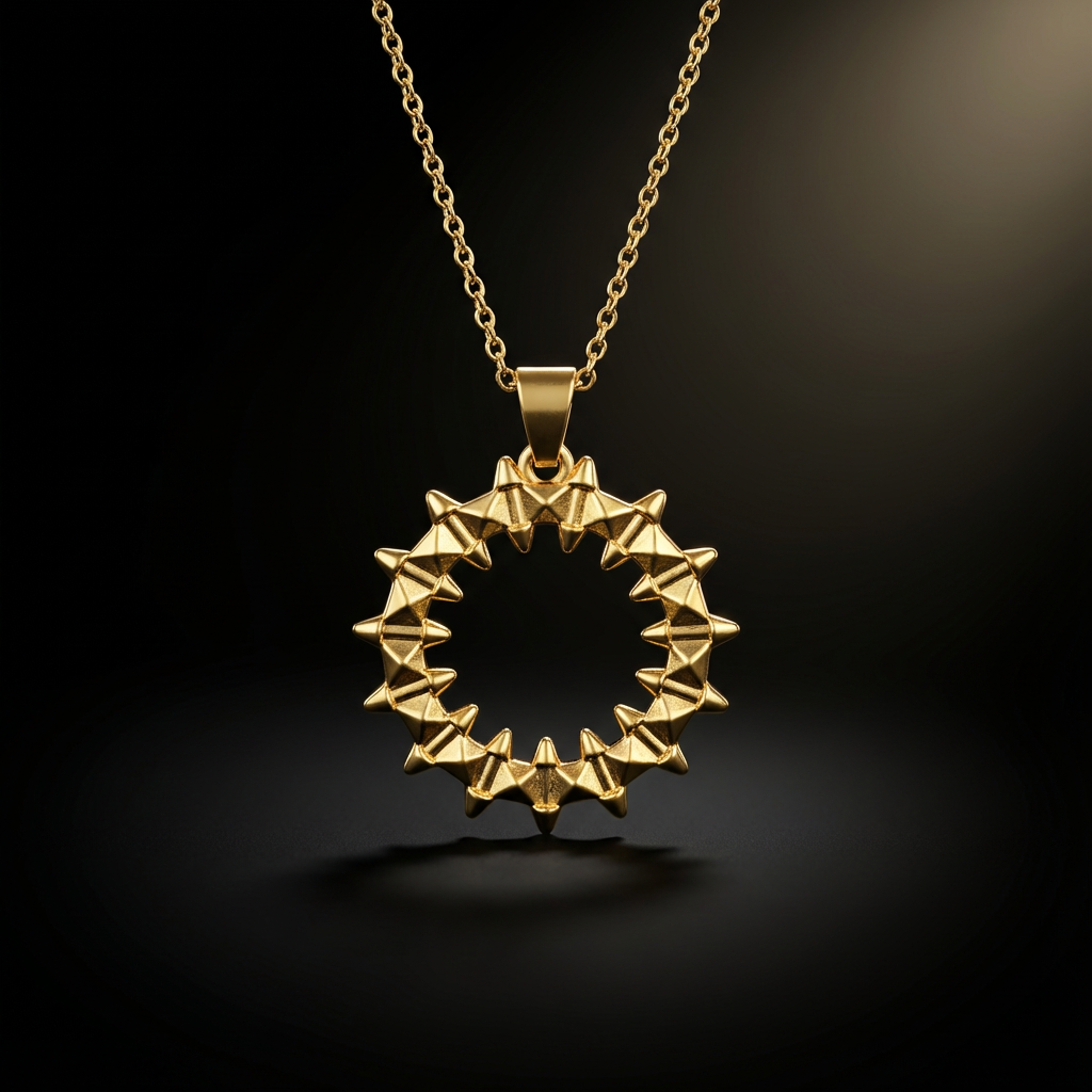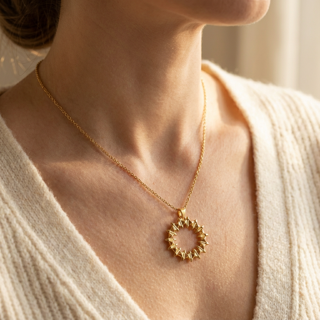 Sublimez votre tenue quotidienne avec ce collier en acier inoxydable haute qualité au pendentif « soleil piqué » (cercle de picots pyramidaux 3D dorés): un mix parfait entre minimalisme et caractère, qui attire le regard sans en faire trop (bureau, café, week-end, soirée entre amis).