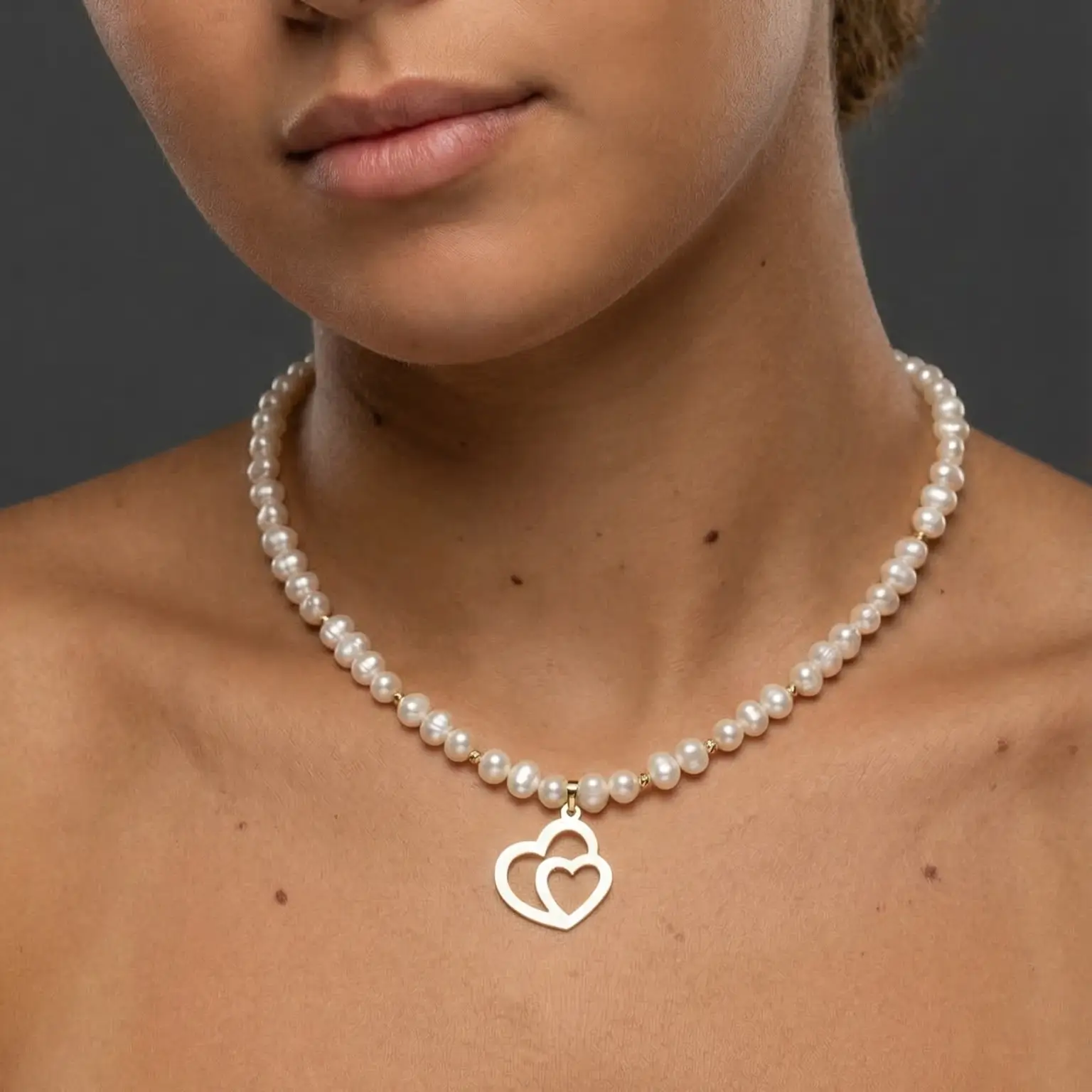 Collier prestigieux associant un pendentif Double Coeur et 6 boules en Or 18 carats à de véritables perles d’eau douce. Ajustable grâce à son fermoir en macramé artisanal. Un symbole d’élégance intemporelle pour vos grandes occasions.