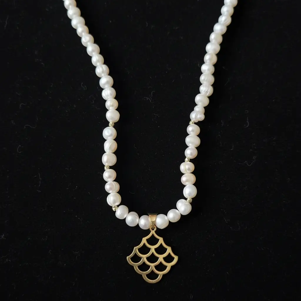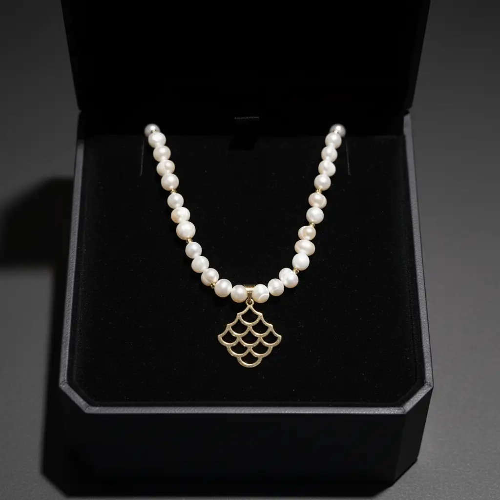 L’élégance classique rencontre l’architecture marocaine avec ce sublime collier en véritables perles Jouher. Son pendentif exclusif en Or 18K, inspiré des motifs traditionnels (Moucharabieh / Arabesque), apporte une touche audacieuse et résolument luxueuse à votre tenue. C’est le bijou parfait pour affirmer votre identité avec prestige.