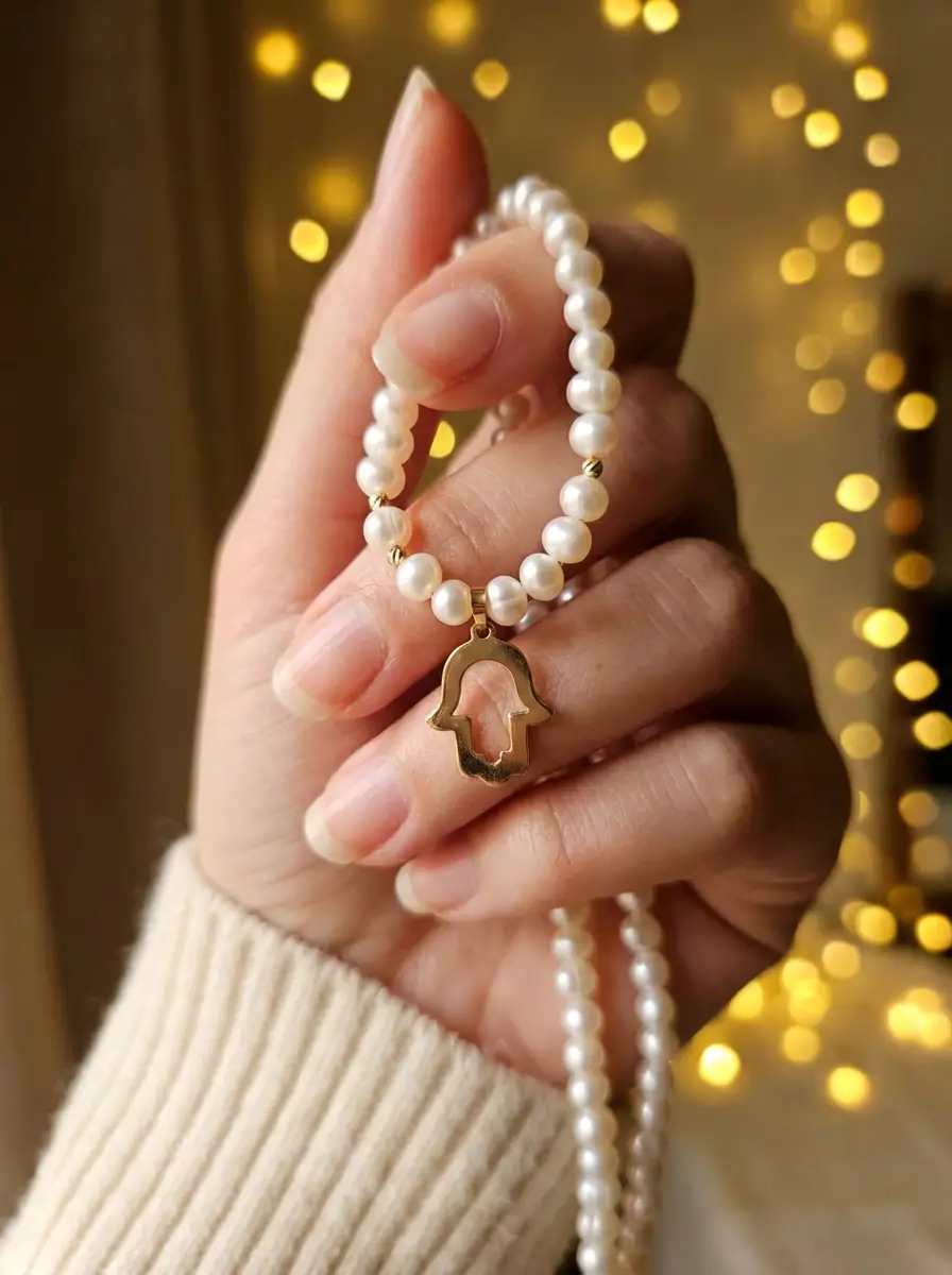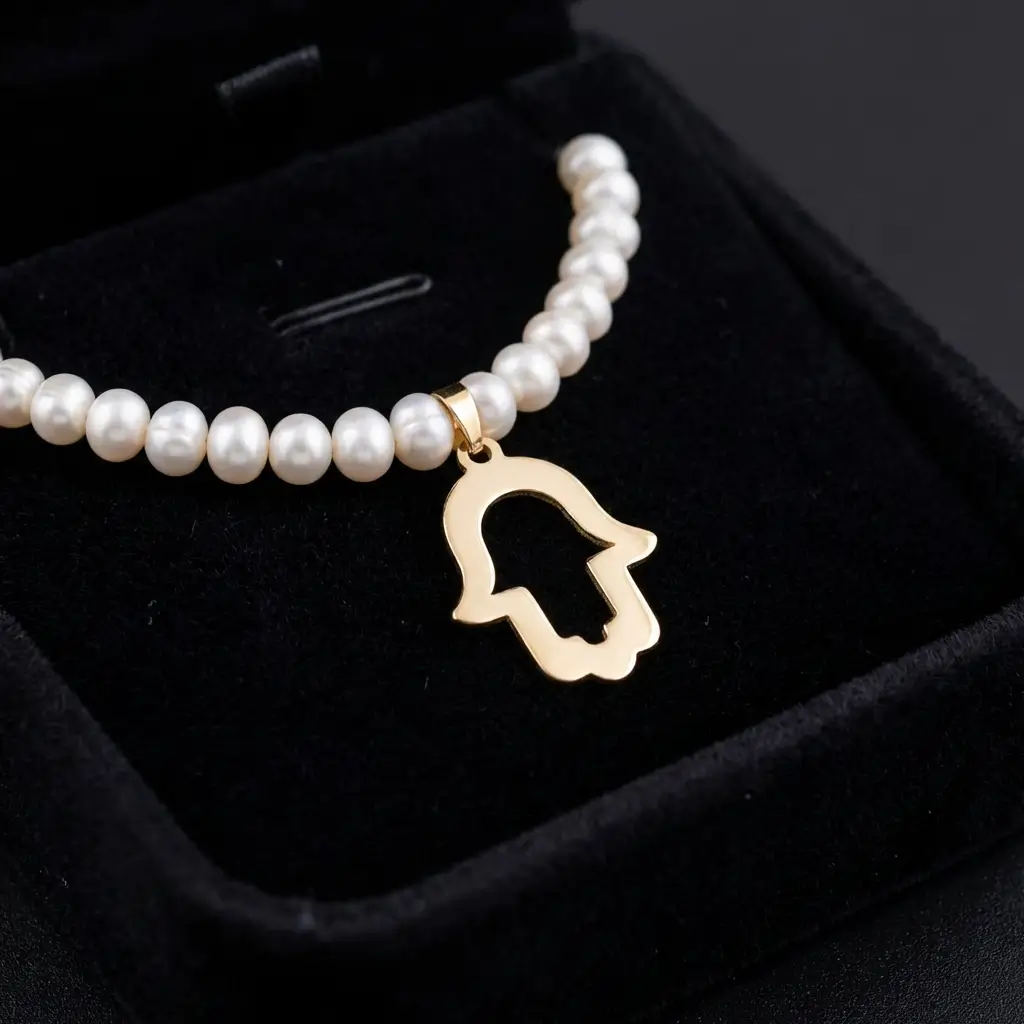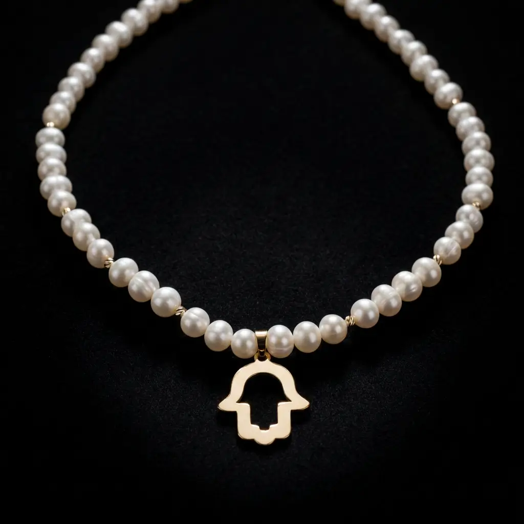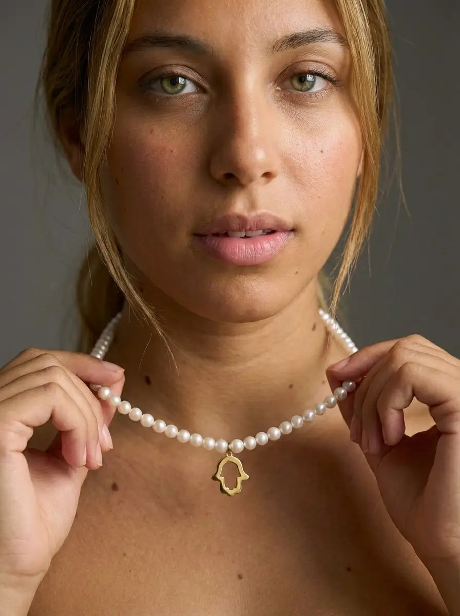 Sublimez votre allure avec cette création exclusive Orjouane. Symbole universel de protection, la Khmissa en or 18 carats est ici sublimée par la douceur nacrée des perles d’eau douce. Que ce soit pour rehausser un Caftan de mariée ou apporter une touche de luxe absolu à une tenue de soirée, cette pièce maîtresse attire la lumière et tous les regards.