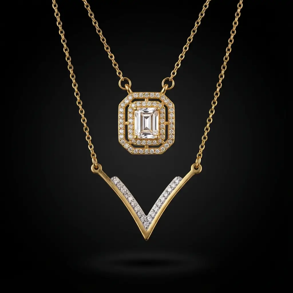 Le premier rang met en avant un pendentif V pavé de zircons qui épouse naturellement la ligne du décolleté, tandis que le second rang présente un pendentif rectangulaire halo zircon taille émeraude inspiré de la joaillerie luxe. L’ensemble crée un mix parfait entre minimalisme géométrique et éclat précieux.